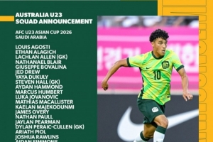 体育资讯1月4日讯 今日,亚足联官方公布参加U23亚洲杯各队球员名单及球员号。本次澳大利亚U23自预选赛以来,再度与U23国足同组,他们的球员名单和球衣号如下: