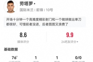 体育资讯1月5日讯 国米在本轮意甲对阵博洛尼亚,劳塔罗本场数据如下:
