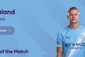 本场比赛哈兰德点射破门,打破3场进球荒,赛后他也当选英超官方球迷票选全场最佳球员。