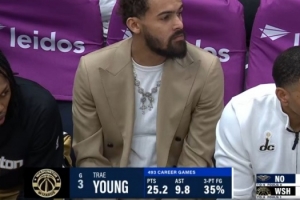 GIF-特雷·杨替补席指导年轻球员