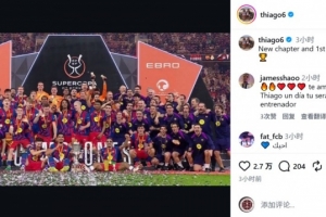 目前担任巴萨助教的蒂亚戈更新社媒动态,晒出球队大合照,庆祝球队夺冠,配文:“新的篇章,本赛季首冠。”