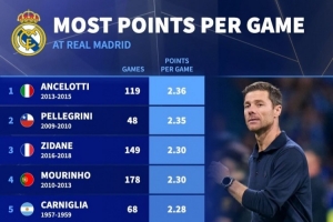 皇马主帅场均积分排名(至少执教30场):