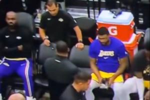 视频中复盘的球迷破防:“雷迪克正想对全队讲话呢,勒布朗你人在哪?有人看到勒布朗了吗?原来他在那儿像个受气的小媳妇儿一样撅嘴闹情绪呢。(Pouting like a little b**ch)”