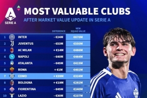 体育资讯12月24日讯 德国转会市场列出了意甲球队身价排名,国米、尤文、米兰前三。