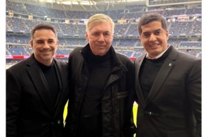 巴西国家队官方更新社媒动态,晒出安切洛蒂与巴西足协副主席迪亚斯、国家队总监卡埃塔诺在伯纳乌的合照。