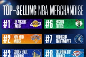 上半赛季球队球衣销量!湖人尼克斯勇士前3 马刺第4 雷霆第8