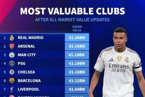 体育资讯12月27日讯 德国转会市场更新了各大联赛的球员身价,并列出俱乐部身价最新排名,皇马13.8亿欧居首,阿森纳、曼城、巴黎前四。